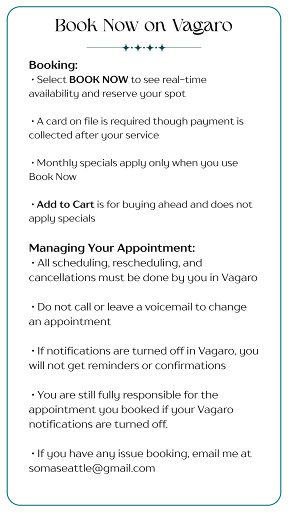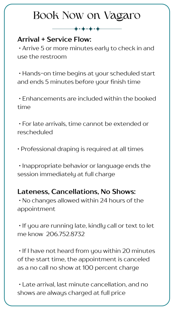 See appointment confirmation email for Winter Cancellation Policy and Directions