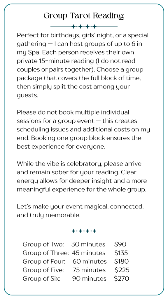 Illumination Tarot Reading: Both Individual and Group are available both Live at my location and Virtually via Zoom. If you would like to have a Group Tarot Reading at your location please email me for details.